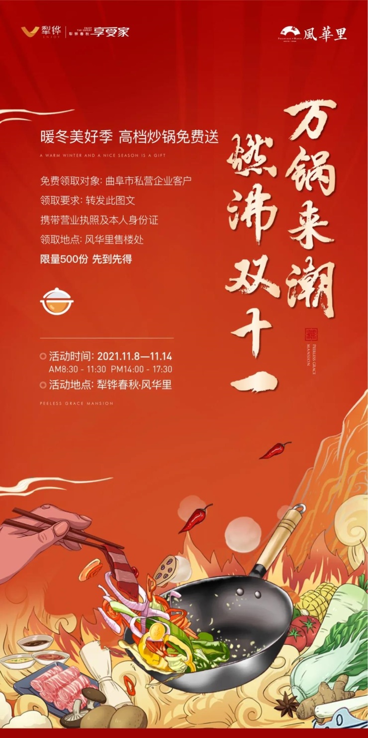 暖冬美好季,高档炒锅免费送。免费领取对象:曲阜市私营企业客户。携带营业执照及本人身份证,到访犁铧春秋风华里售楼处。