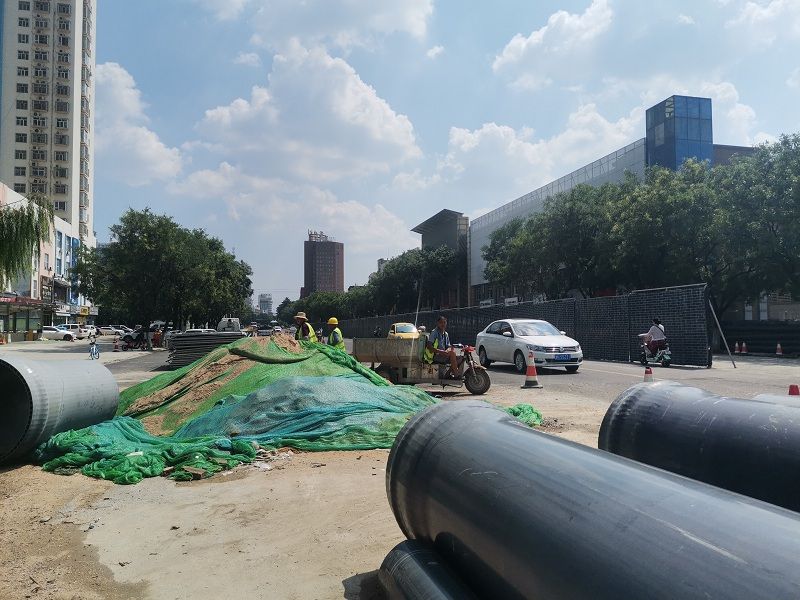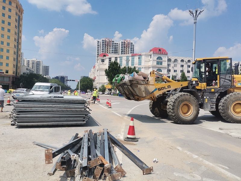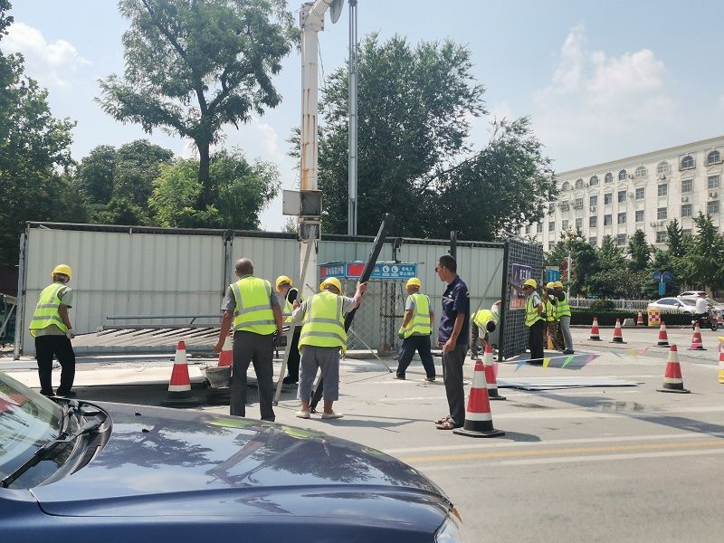 8月2日中午,记者在古槐路和洸河路交叉路口看到,艳阳高照下,市政工人仍在紧张作业中,红星路到洸河路之间的路段正在有序拆除围挡中,路东围挡已经全部拆除,路西围挡正在拆除中。