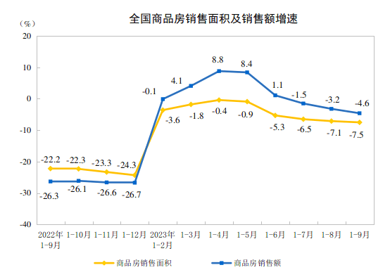 1—9月份,商品房销售面积84806万平方米,同比下降7.5%,其中住宅销售面积下降6.3%。商品房销售额89070亿元,下降4.6%,其中住宅销售额下降3.2%。