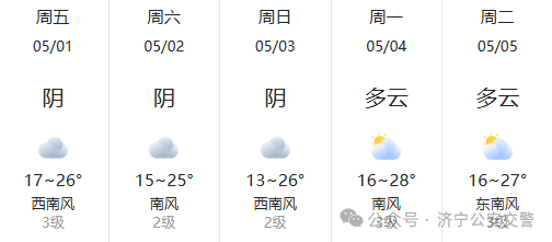 根据 据气象部门预测, 小长假期间, 预计本周济宁市以阴到多云天气为主,最高气温出现在5月4日,28℃左右。