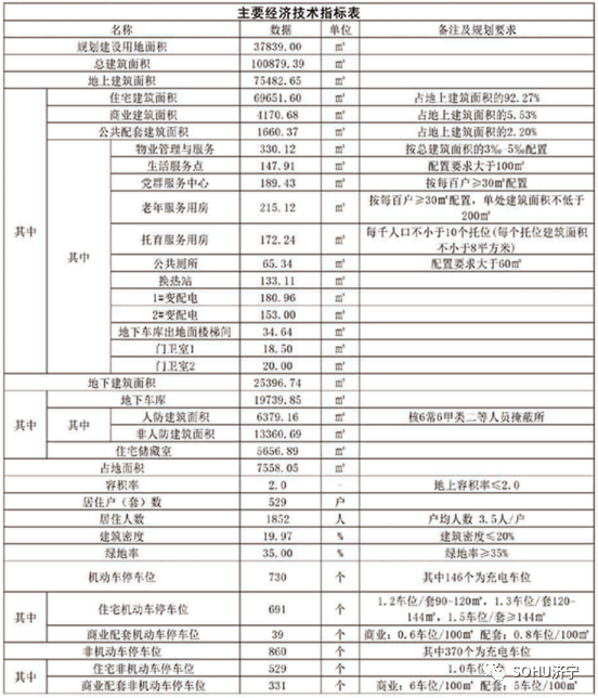 项目规划建设用地面积37839㎡(约57亩);总建筑面积:100879.39㎡;其中地上建筑面积为75482.65㎡,地下建筑面积25396.74㎡;容积率为2.0;建筑密度19.97%;绿地率35%;计划总居住户(套)数为529户(套),居住人数约1852人(按3.5人/户预算);建筑类型包括住宅、商业、幼儿园、公共配套设施等;规划机动车停车位730个,非机动车位860个。
