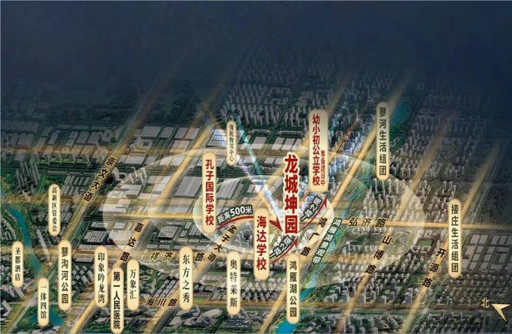 龙城坤园自择址之初,便以前瞻性视野落位蓼河城央,咫尺鸿广河自然休闲景观带和鸿雁湖公园,这里汇聚了海达行知学校、孔子国际学校和规划公立学校,三校环绕,繁华大境与生态鲜氧兼得,成为置业者的理想居住地。项目雄踞于此,多元配套加持,交通红利赋能,营造醇熟生活氛围。