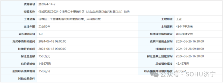 土地位于:任城区二十里铺街道北站站前路以南、兴科路以东;土地面积:42447㎡(约63.7亩);土地用途:工业用地;出让年限:50年;容积率不小于1.0;起始价:1486万元,综合楼面价起价:350元/㎡;