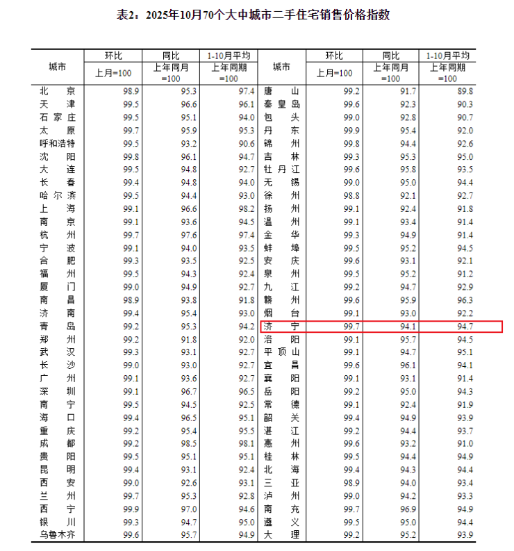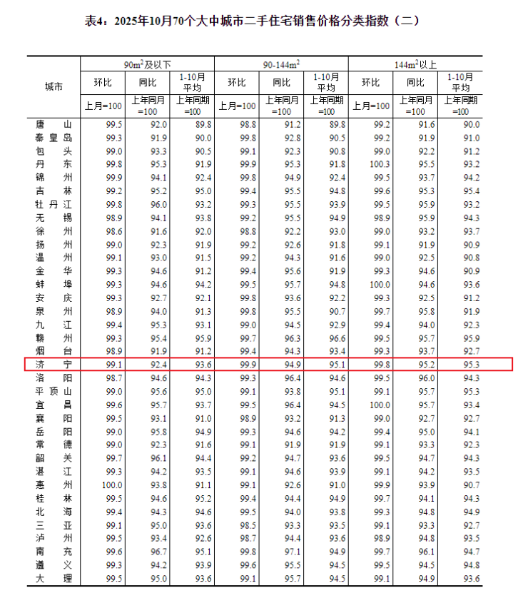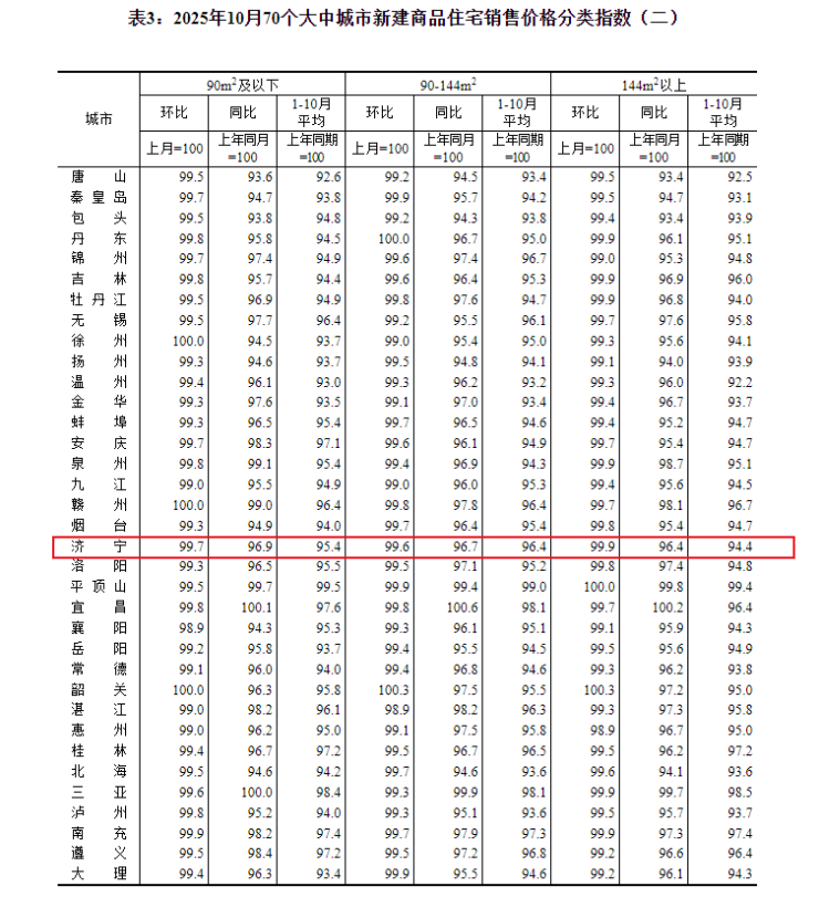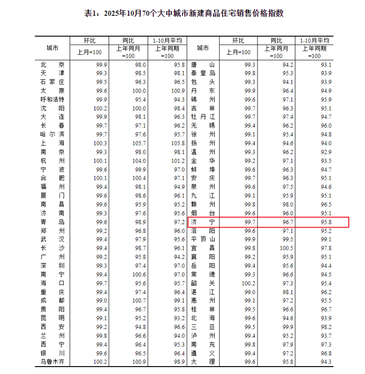 搜狐网济宁小编注意到:今早9点30分,国家统计局发布了2025年10月份70个大中城市商品住宅销售价格变动情况统计数据。2025年10月份济宁新建商品住宅销售价格环比下降0.3个百分点。