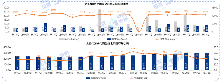 存量:截至周末,济宁市存量58.82万㎡,以近6个月的销售速度估算,去化周期约为155个周。