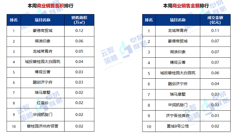第53周豪德商贸城项目以销售面积0.12万㎡,位居商业销售面积排行榜排名前列,龙城常青府项目以销售金额0.11亿元,位居商业销售金额排行榜排名前列。