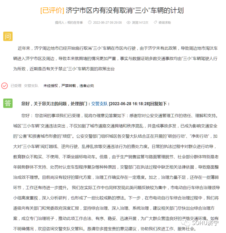 济宁城区有无取消“三小”车辆的计划?较新官方回应来了