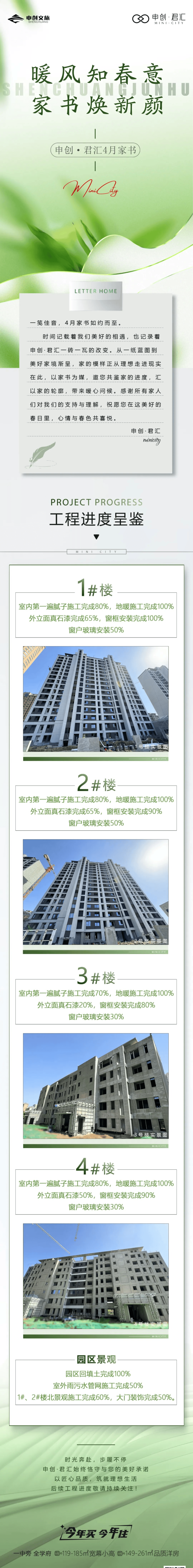 申创·君汇一砖一瓦的改变。从一纸蓝图到美好家境渐呈,家的模样正从理想走进现实在此,以家书为媒,邀您共鉴家的进度,汇以家的轮廓,带来暖心问候。感谢所有家人们对我们的支持与理解,祝愿您在这美好的春日里,心情与春色共喜悦。