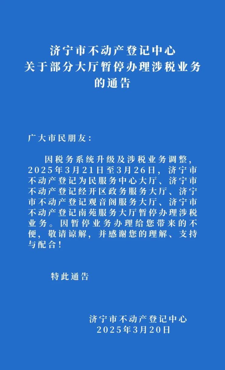 因税务系统升级及涉税业务调整,2025年3月21日至3月26日,济宁市不动产登记为民服务中心大厅、济宁市不动产登记经开区政务服务大厅、济宁市不动产登记观音阁服务大厅、济宁市不动产登记南苑服务大厅暂停办理涉税业务。因暂停业务办理给您带来的不便,敬请谅解