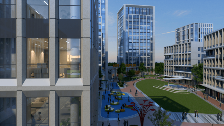 未来城秉持低碳、生态、健康理念,项目规划近30%园区整体绿化率,形成“一带两轴两心多点”的景观系统,近1.5万㎡公共绿地面积,使建筑掩映在庭院绿植中,同时借助基地的开放性,与北邻滨河城市公园融为一体,有效促进了城市景观与园区空间交织,提供自然、舒适、充满活力的基地环境,满足入驻企业和商务人士的高标准活动需求。