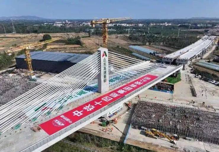 该转体桥位于沂水县四十里堡镇薛家河村西北,桥体边缘距铁路栅栏最近处仅12.9米,施工技术难度大。作为山东省内最大不等跨斜拉转体桥,其主跨为80米+100米双向不平衡矮塔斜拉桥,转体T构总重量达2.5万吨,转体长度177米,逆时针旋转67.4度,施工过程中创新采用国内第七代双侧双向抗滑拉索体系,并通过全过程实时监测与精准调控,确保了桥梁顺利转体与精准对接。