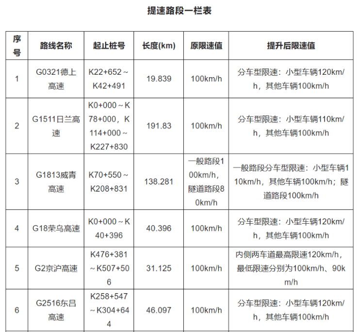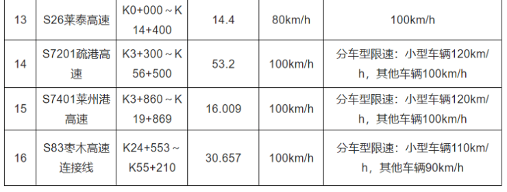 9月30日,山东省公安厅、山东省交通运输厅发布通告,10月1日起,对G0321德上高速、G1511日兰高速、G2京沪高速等16条高速公路(共计848.092公里)部分路段限速值进行调整,相关路段沿线的限速标志、标线、测速执法等监控技术设备参数也将同步调整。具体调整路段情况如下表所示: