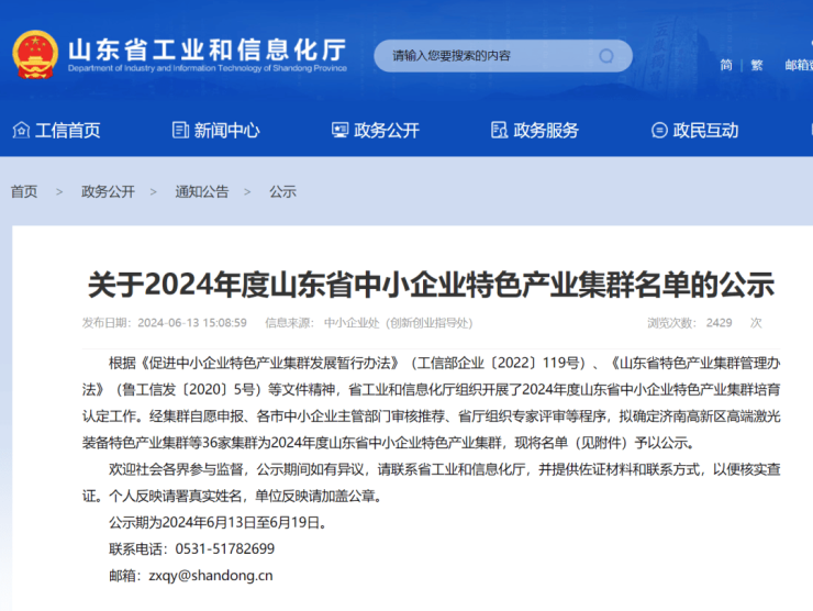 根据《促进中小企业特色产业集群发展暂行办法》(工信部企业〔2022〕119号)、《山东省特色产业集群管理办法》(鲁工信发〔2020〕5号)等文件精神,省工业和信息化厅组织开展了2024年度山东省中小企业特色产业集群培育认定工作。经集群自愿申报、各市中小企业主管部门审核推荐、省厅组织专家评审等程序,拟确定济南高新区高端激光装备特色产业集群等36家集群为2024年度山东省中小企业特色产业集群,现将名单(见附件)予以公示。