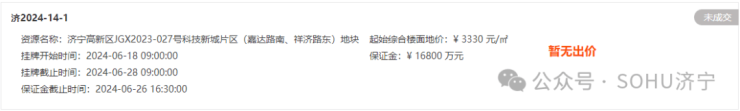 土地位于:济宁高新区嘉达路以南、祥济路以东;土地面积:55825㎡(约83.7亩);土地用途:商服住宅用地;出让年限:住宅70年、商服40年;容积率不大于1.8;起始价:33462万元,综合楼面价起价:3330元/㎡;最终成交价为:33462万元(约400万元/亩),综合楼面地价成交价:3330元/㎡;溢价率:0.0%;最终因无竞价方出价,流拍。