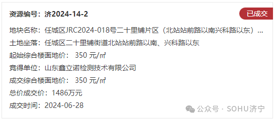 地块二:任城区JRC2024-018号二十里铺片区(北站站前路以南兴科路以东)地块【山东鑫立诺检测技术有限公司竞得】