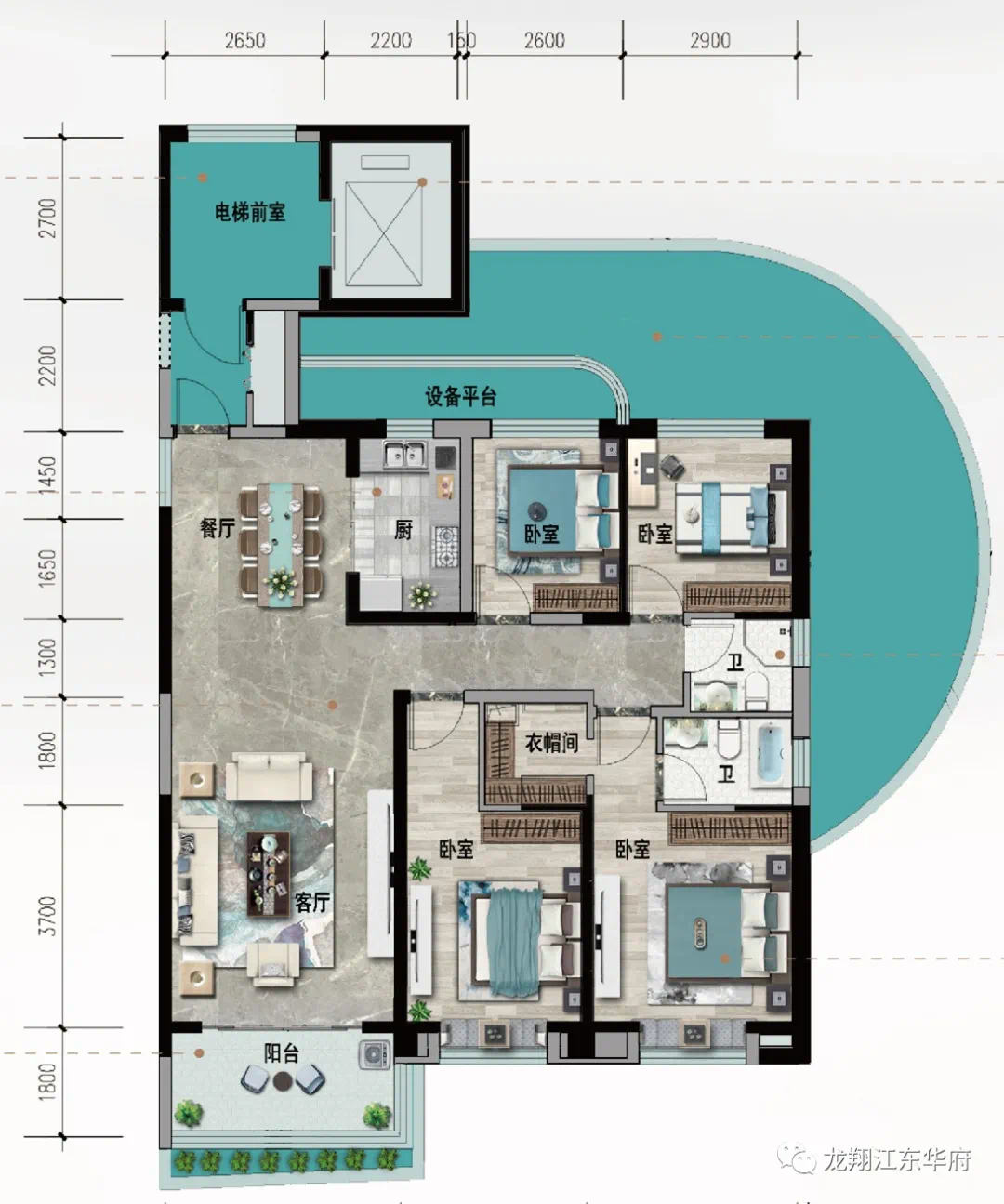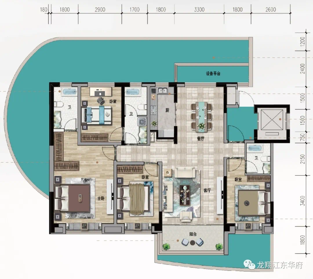 在龙翔江东华府,户型方正的“集福堂”,竟也附加了约50㎡的弧形飘台,看看户型图: