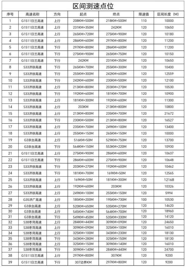 为进一步加强高速公路交通安全管理,规范行车秩序,预防和减少道路交通事故发生,依据《中华人民共和国道路交通安全法》《中华人民共和国道路交通安全法实施条例》《山东省高速公路设置应用区间测速指导意见》等法律法规及规定,现将济宁市公安局高速公路交通警察支队测速取证设备地点公示如下:
