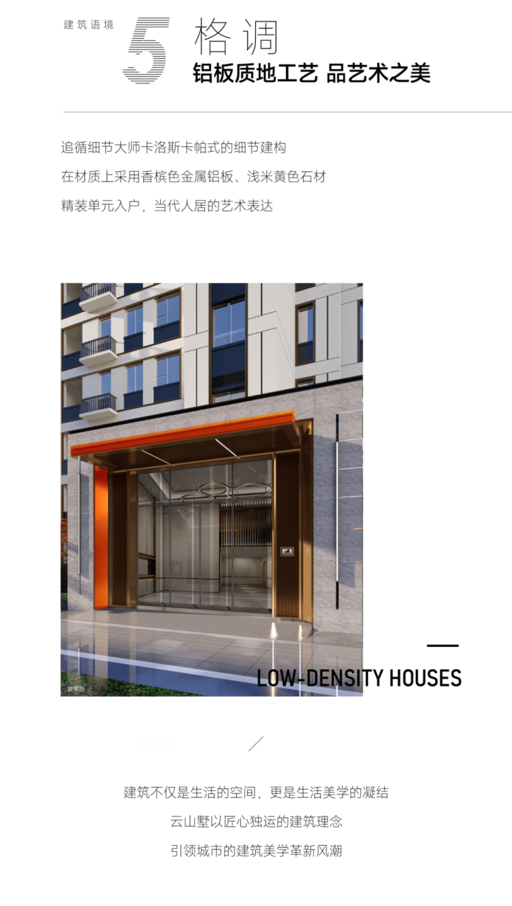 吉开·云山墅建筑横向汲取岗山意象,将山之层叠、水之涟漪、云之舒卷融入建筑,形成横显竖隐的线条造型。建筑立面虚实层次丰富,居中稳重又不失轻盈现代,形成云山墅独有的建筑美学秩序。