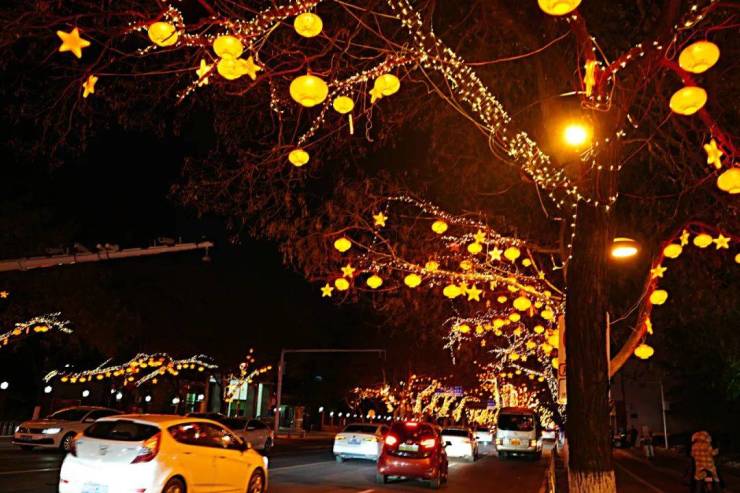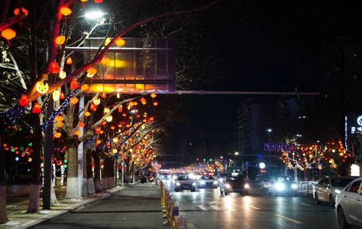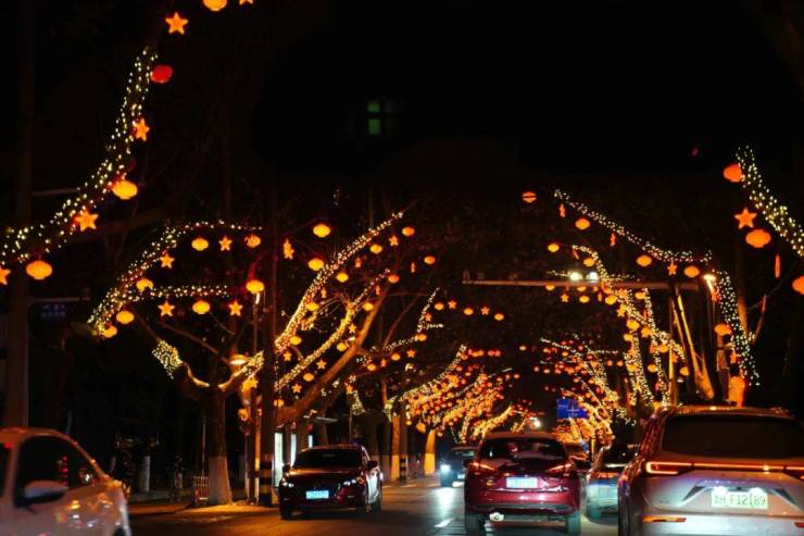 红星路路段亮灯设计是以黄色星星灯缠绕树干,车行道一侧悬挂红灯笼和红五星至树梢,让两侧灯笼“牵手”连在一起,打造拱门星光隧道,象征着济宁市人民心连心、手牵手。街角公园安装“桃花灯”“福兔迎春”、“2023”等造型,来营造喜庆祥和的新春氛围。