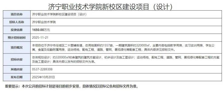 2025年10月20日,济宁市公共资源交易平台发布《济宁职业技术学院新校区建设项目(设计)招标计划》,项目选址于济宁市任城区二十里铺街道,总用地面积约1557亩,投资估算1650万元,一期规划建筑面积32万平方米,建成后将成为区域职业教育的重要基地。
