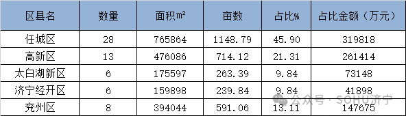 济宁高新区:13宗,面积476086平方米,约合714.12亩,占总面积的21.31%;