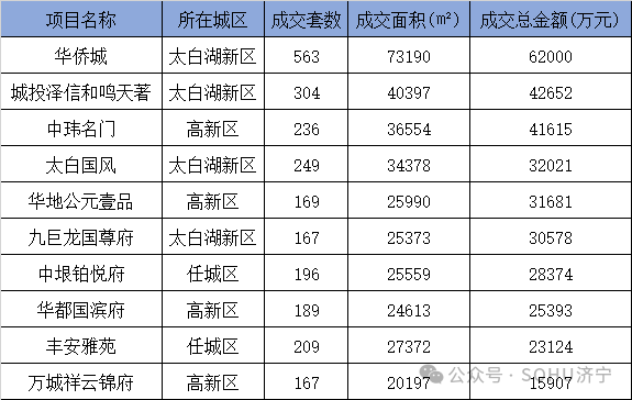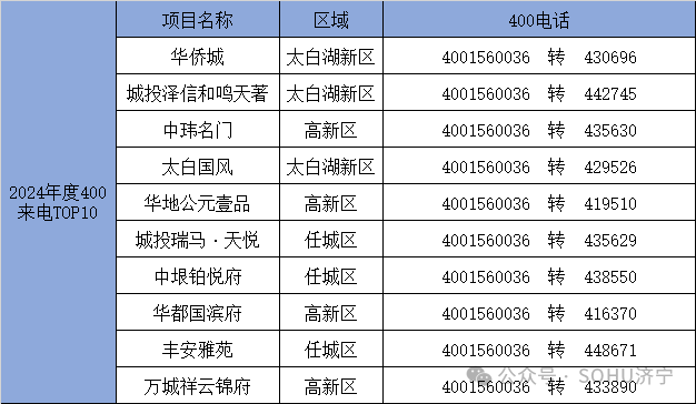 搜狐焦点济宁站2024年来电量排名前10的房地产项目分别为:华侨城、城投泽信和鸣天著、中玮名门、太白国风、华地公元壹品、城投瑞马·天悦、中垠铂悦府、华都国滨府、丰安雅苑、万城祥云锦府等。