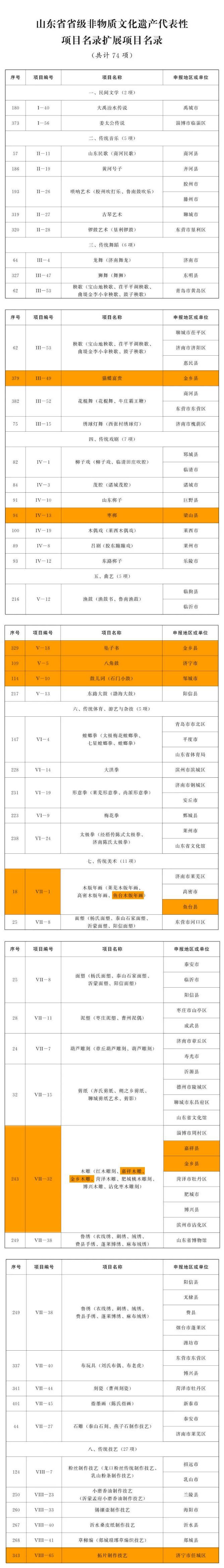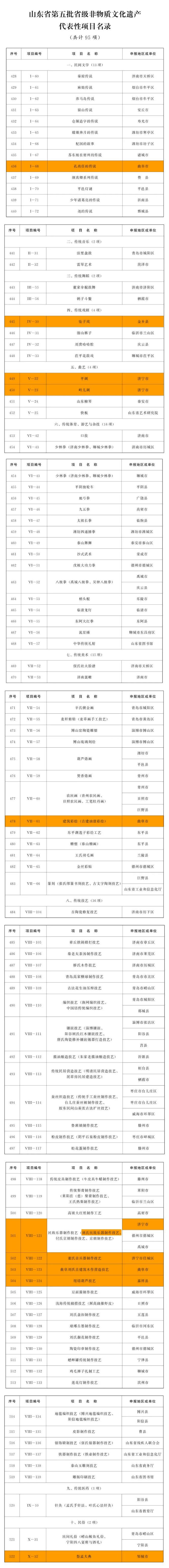 公布的第五批省级非物质文化遗产代表性项目名录共169项,其中,新列入项目95项,扩展项目74项。济宁市新列入项目入选10项,扩展项目入选14项,入选项目数量位居全省第三。