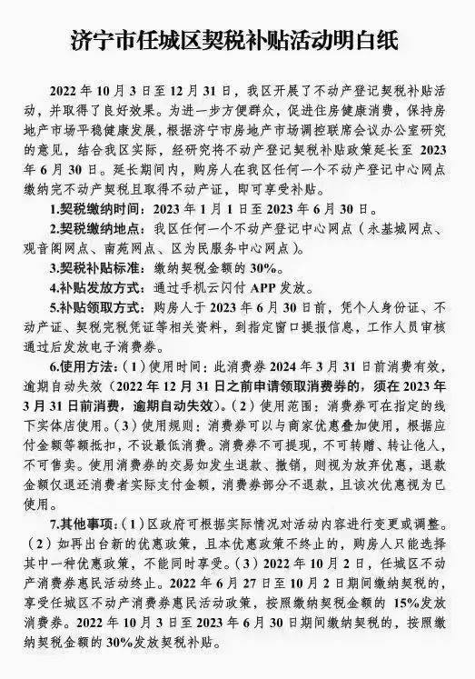 (3)2022年10月2日,任城区不动产消费券惠民活动终止。2022年6月27日至10月2日期间缴纳契税的享受任城区不动产消费券惠民活动政策,按照缴纳契税金额的15%发放消费券。2022年10月3日至2023年6月30日期间缴纳契税的,按照缴纳契税金额的30%发放契税补贴。
