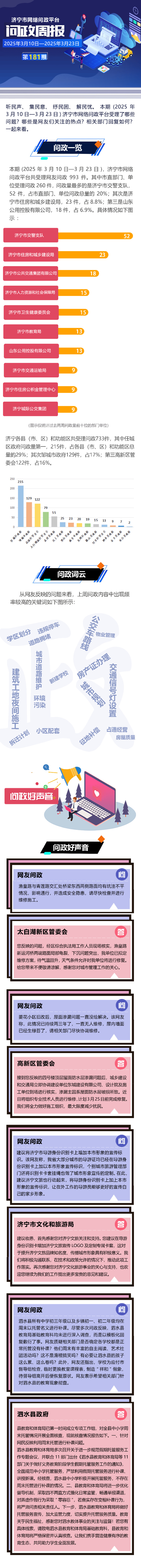 听民声、集民意、纾民困、解民忧。本期(2025年3月10日一3月23日)济宁市网络问政平台受理了哪些问题?哪些是网友们关注的热点?相关部门回复如何?一起来看。