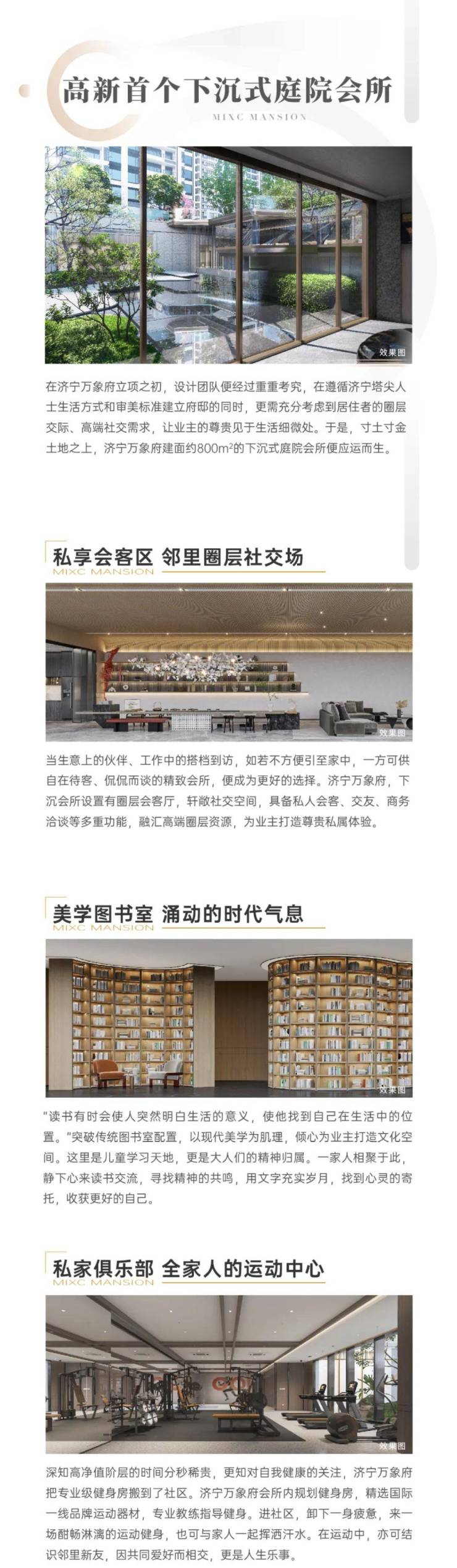华润置地万象府在遵循济宁塔尖人士生活方式和审美标准建立府邸的同时,更需充分考虑到居住者的圈层交际、高端社交需求,让业主的尊贵见于生活细微处。于是,寸土寸金土地之上,华润置地万象府建面约800㎡的下沉式庭院会所便应运而生。