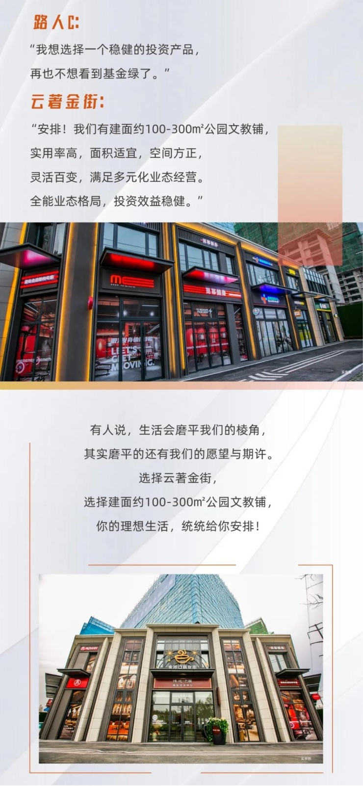 有人说,生活会磨平我们的棱角,其实磨平的还有我们的愿望与期许。选择博观云著金街,选择建面约100-300㎡公园文教铺,你的理想生活,统统给你安排!
