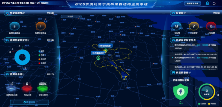 桥梁群结构监测系统项目包括G105济宁段6座大中桥,通过布设低功耗、易安装、高效率的智能感知设备,结合传感技术与大数据分析,实现对桥梁结构健康状况24小时实时监控和评估。该系统如同桥梁安全的“智慧管家”,能智能识别早期病害,异常情况下立即启动预警,辅助制定科学养护计划,避免盲目维修,延长桥梁使用寿命,保障结构安全。
