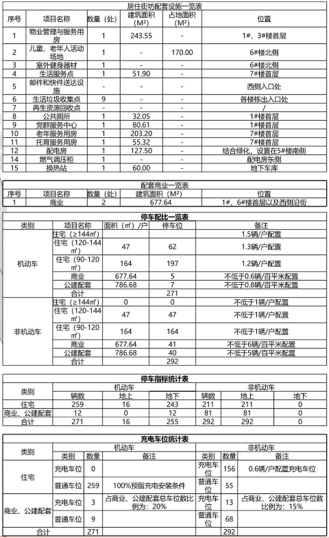 地块一:总建筑面积38164.56㎡,其中地上计容建筑面积26505㎡,新建住宅24913.18㎡,商业677.64㎡,配套914.18㎡,地下建筑面积11659.56㎡,绿化面积6184.4㎡,基底面积5119.24㎡,机动车停车位271个,非机动车停车位292个,总户数211户。