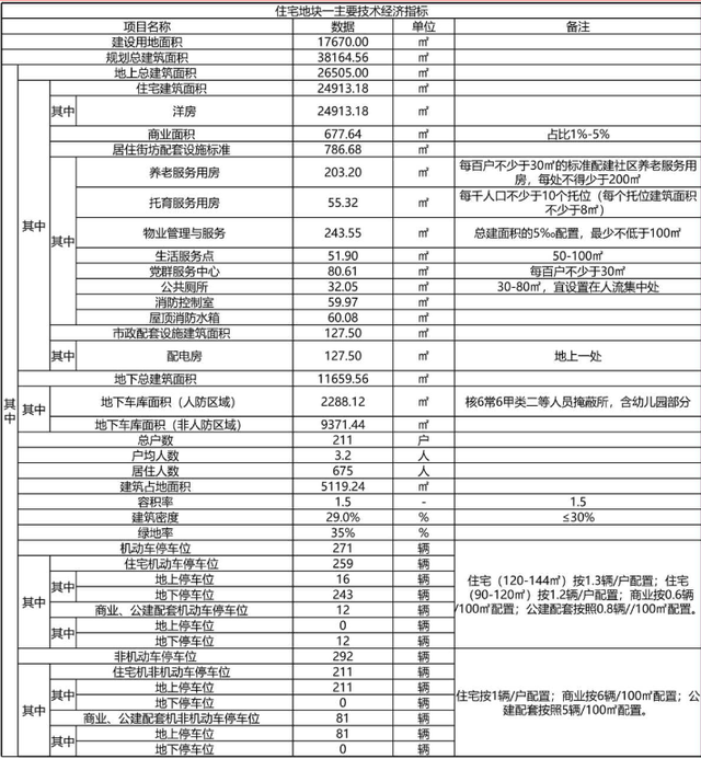 项目规划建设用地面积17670㎡;总建筑面积:38164.56㎡;其中,地上总建筑面积:26505㎡,地下总建筑面积11659.56㎡。容积率1.5;建筑密度29%;绿地率35%;计划总居住户(套)数为211户(套),居住人数约675人(按3.2人/户预算);建筑类型包括住宅、商业、幼儿园、公服配套设施等;规划机动车停车位271个,非机动车停车位292个。