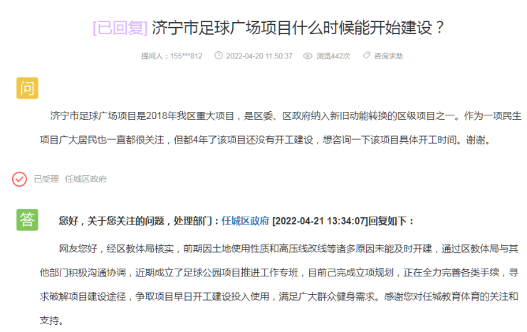 近日,搜狐网济宁小编在济宁市网络问政平台上注意到有网友提问: 济宁市足球广场项目是2018年我区重大项目,是区委、区政府纳入新旧动能转换的区级项目之一。作为一项民生项目广大居民也一直都很关注,但都4年了该项目还没有开工建设,想咨询一下该项目具体开