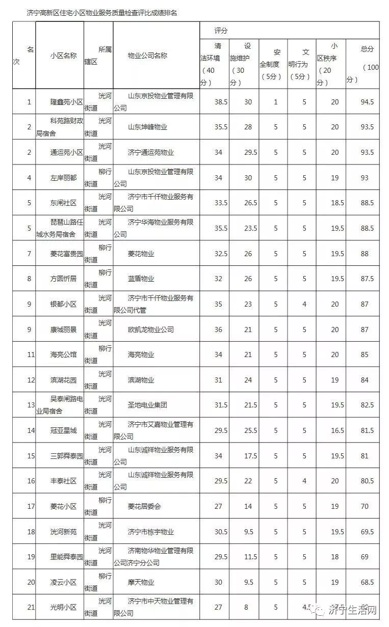 济宁高新区城乡建设局、济宁高新区创城办通报21个住宅小区物业服务质量检查评比成绩及各小区存在的问题......
