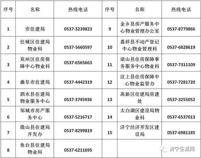 便于住宅小区业主及时反映物业服务中存在的问题,进一步畅通维权渠道,济宁市住房城乡建设局将14个县(市、区)物业行业管理部门的投诉举报电话进行公布。