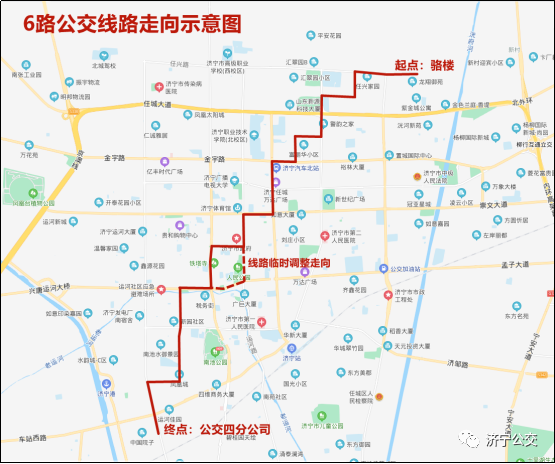 因古槐路道路升级改造,调整后的公交线路临时取消红星路、古槐路沿线站点停靠,临时调整线路走向为共青团路、太白楼路,临时停靠:运河宾馆、人民公园、文化广场、太白金店(太白楼)4处公交站点。