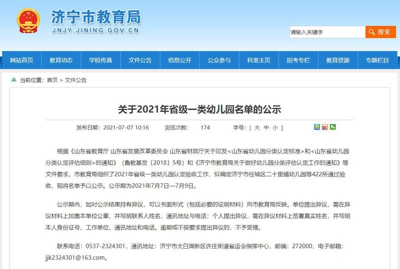 7月7日,济宁市教育局发布《关于2021年省级一类幼儿园名单的公示》,根据《山东省教育厅 山东省发展改革委员会 山东省财政厅关于印发<山东省幼儿园分类认定标准>和<山东省幼儿园分类认定评估细则>的通知》(鲁教基发〔2018〕5号)和《济宁市教育局关于做好幼儿园分类评估认定工作的通知》等文件要求,市教育局组织了2021年省级一类幼儿园认定验收工作,拟确定济宁市任城区二十里铺幼儿园等422所通过验收,现将名单予以公示。公示期为2021年7月7日—7月9日。