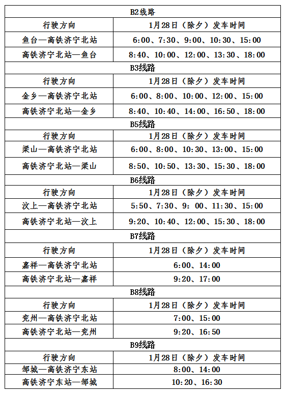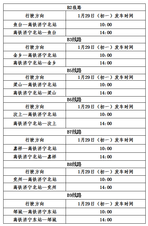 1月30日 (年初二)— 2月4日(年初七)首班兖州7:10发车、济宁人民医院东院区7:20发车,末班17:30发车。