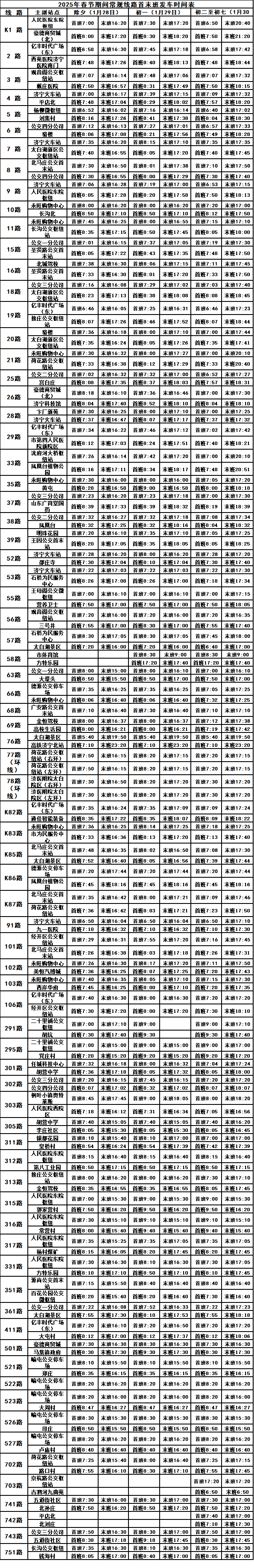 2025年春节将至,为满足市民出行需求,济宁城际公交集团春节期间运营计划临时调整如下: