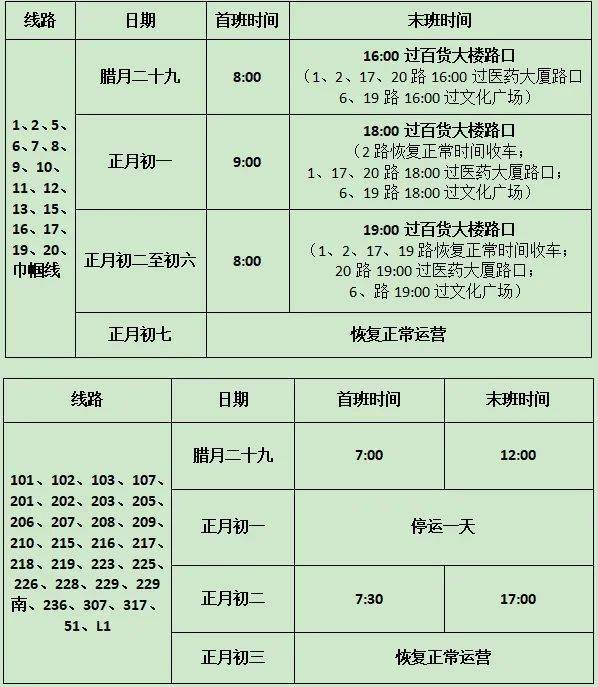 1月28日(除 夕)所有线路首班7:00发车,末班14:30发车,16:30收车。