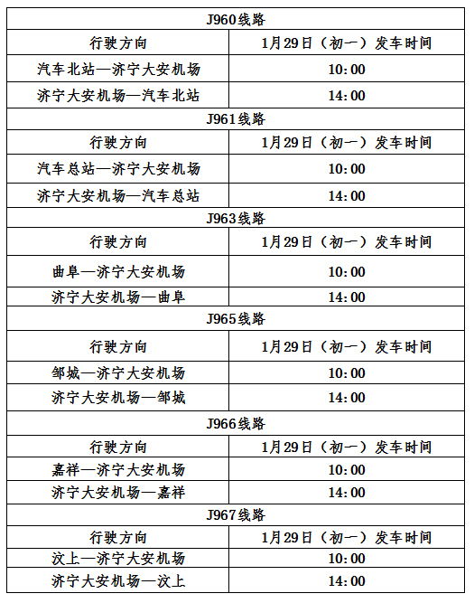 1月29日(年初一)首班9:30发车,末班14:00发车。