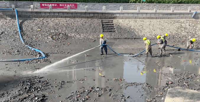 5月6日8时,在越河中心闸附近的一处清淤工作面,工人们正手持高压水枪将越河里沉积的淤泥打碎、冲散,稀释的淤泥随即被高压泥浆泵抽出河道,输送至排泥场。据悉,这是继2015年济宁市主城区河道清淤后,时隔7年,主城区河网开展的又一次全面清淤。
