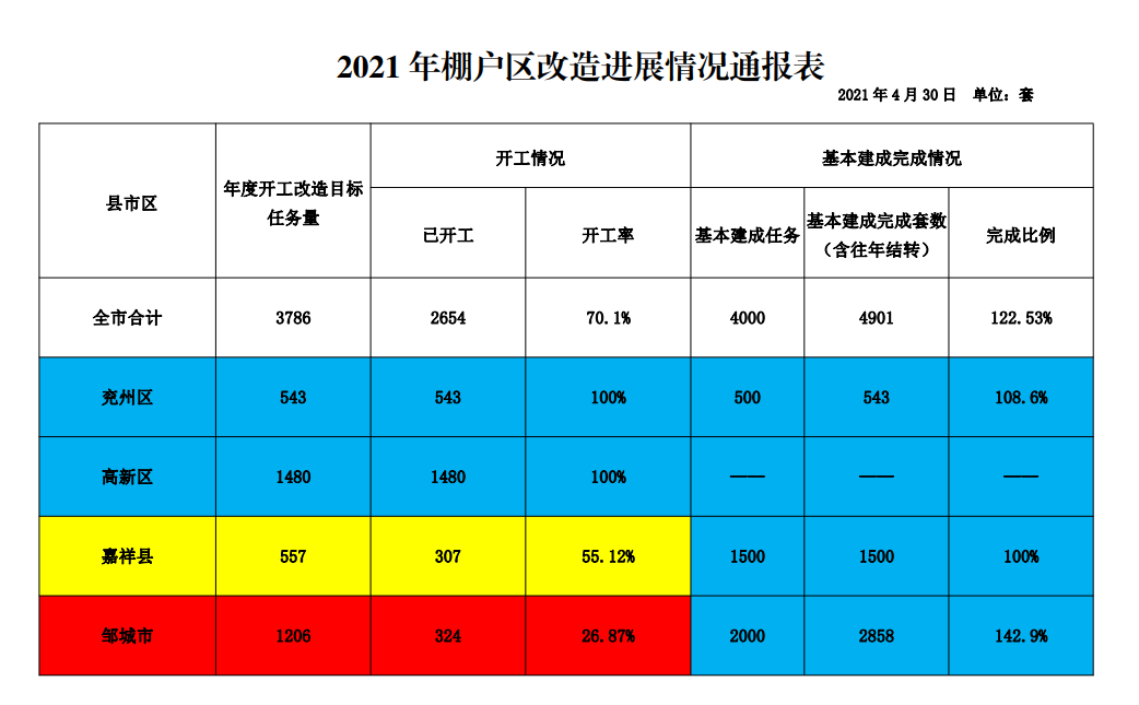 2021年我市棚户区改造任务为开工 3786套,基本建成 4000套。现将截至 4 月底进展情况通报如下: