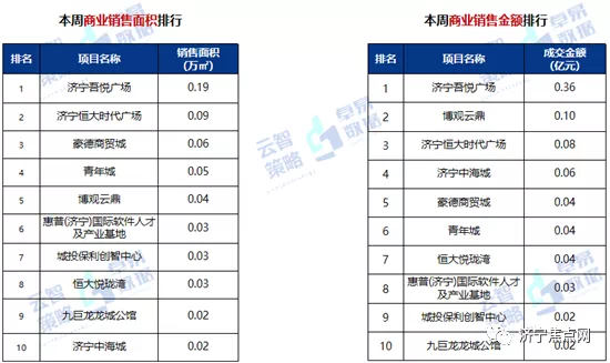 本周济宁吾悦广场项目以销售面积0.19万㎡,销售金额0.36亿元,位居双排行榜排名前列。