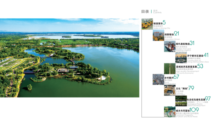 外宣画册共有“制造强市”“创新驱动”“现代港航物流”“济宁都市区建设”“县域经济高质量发展”“乡村振兴”“文化两创”“生态优先绿色发展”“城乡共同富裕”9个篇章。这些作品主题鲜明、瞬间精彩、内涵丰富,或取材于多元文化,或选题于百姓生活,或采撷于发展大潮,或寄情于青山绿水,从不同角度聚焦济宁正在实施的“九大战略”布局,展现了济宁发展的城乡巨变、人文风貌和生态环境之美。