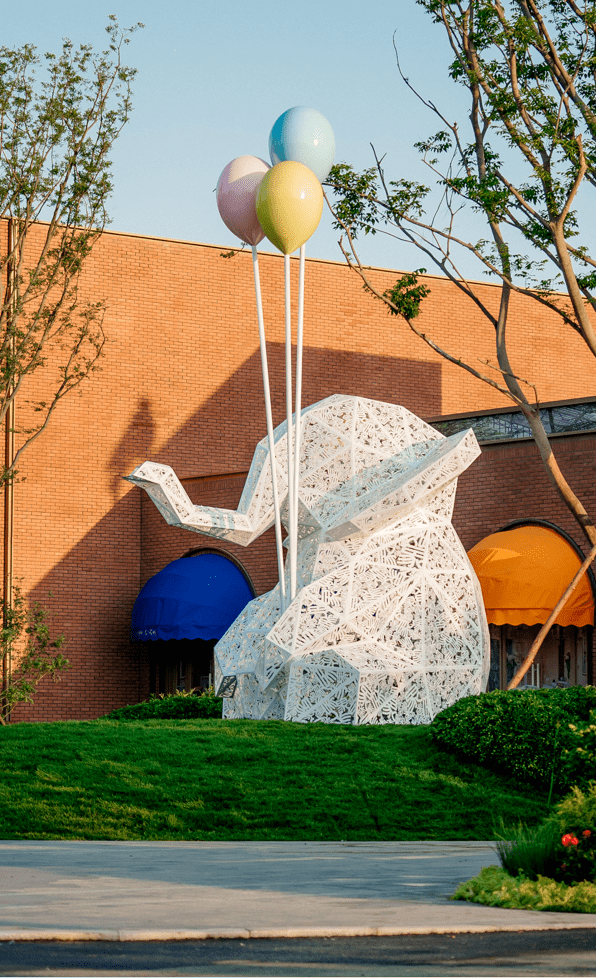两侧拥抱式景墙围合出崭新的活力主入口,仪式感涌泉和秩序感景墙组队迎归,对望的大象雕塑寓意万象更新,小飞象广场童趣盎然,抬头就可看到商铺一角的报喜鸟,呢喃着喜事临门。