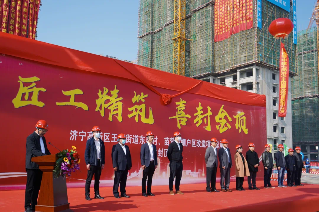 11月18日上午,济宁高新控股集团旗下高新城建投资有限公司承建的王因街道东娄村、苗营村棚户区改造项目举行封顶仪式。