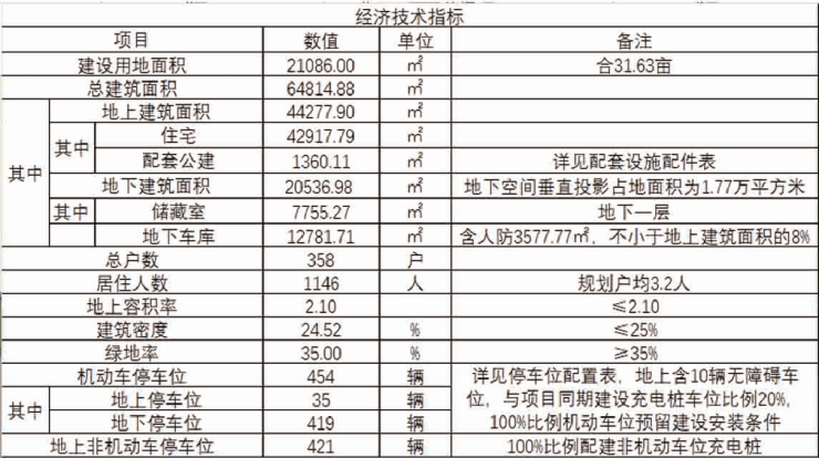 项目规划建设用地面积21086㎡(约32亩);总建筑面积:64814.88㎡;其中地上建筑面积为44277.90㎡、地下建筑面积为20536.98㎡;容积率为2.10;建筑密度24.52%;绿地率35%;计划总居住户(套)数为358户(套),居住人数约1146人(按3.2人/户预算);建筑类型包括住宅、储藏室、地下车库、其他公共配套设施等;规划机动车停车位454个,非机动车位421个。